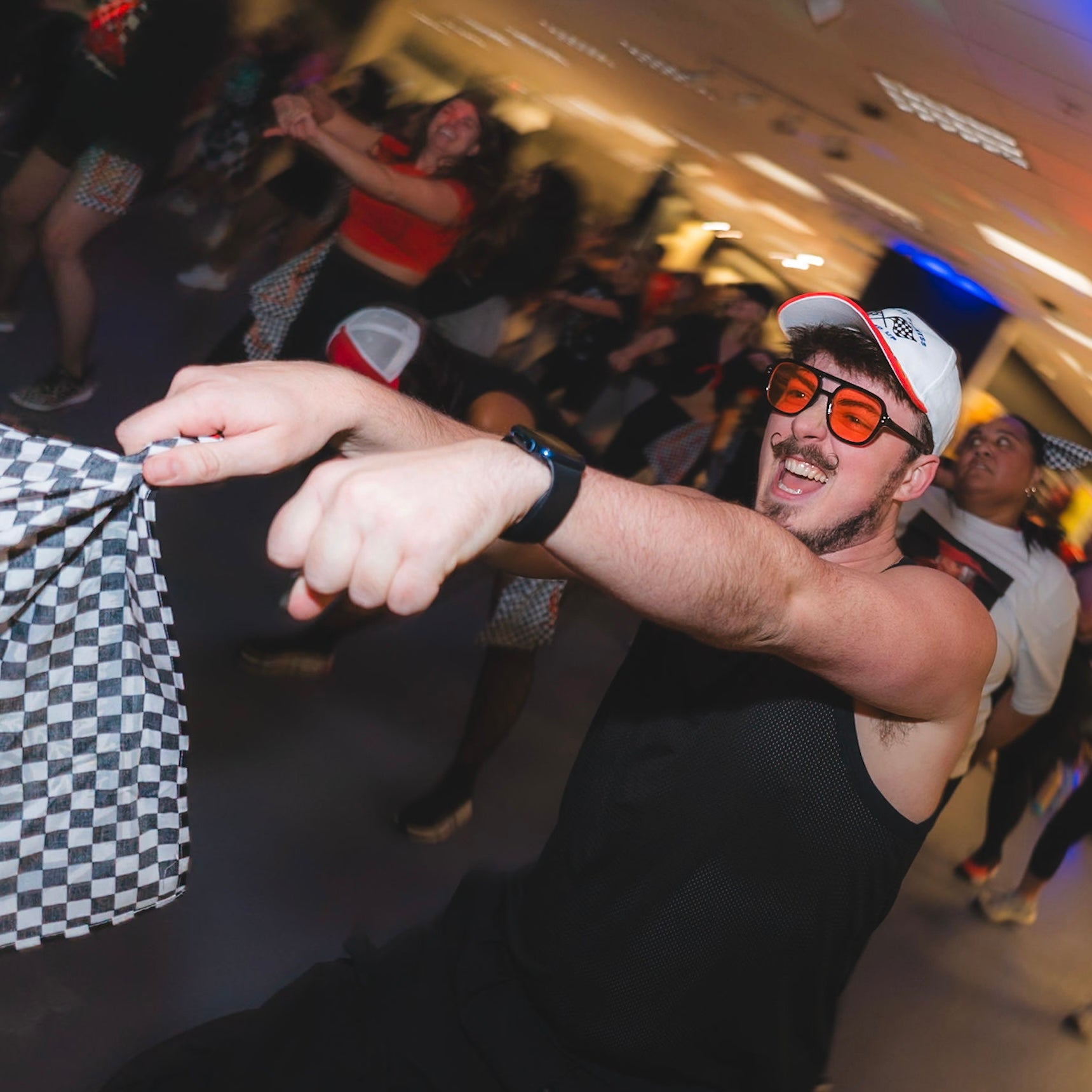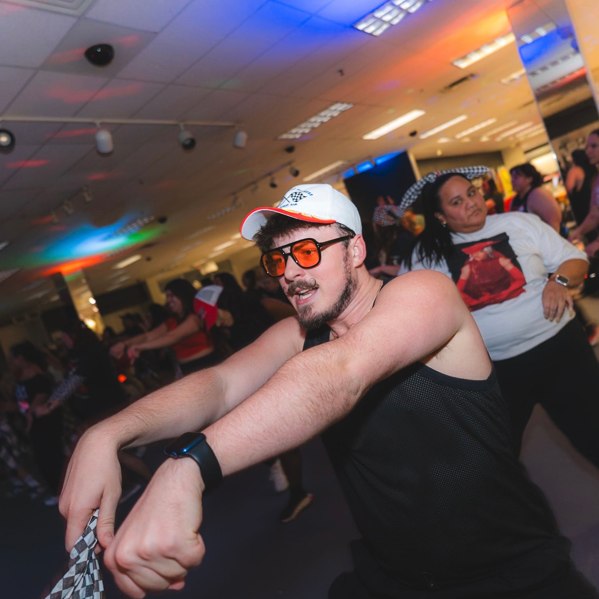 This hat is loud in all the best ways. The front features our Riot Dance Fitness REVVED UP embroidery with crossed checkered flags, giving instant Round X nostalgia. The real showstopper?